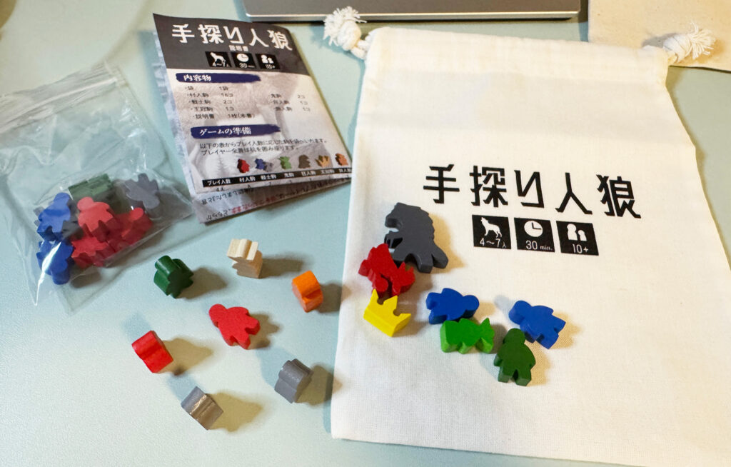 今月発売したばかりのテーブルゲームで、手の感触だけを頼りにして人狼ゲームが遊べる「手探り人狼」を会場で購入しました! 手探りで駒を取り役職を探り合う、人狼ゲーム。